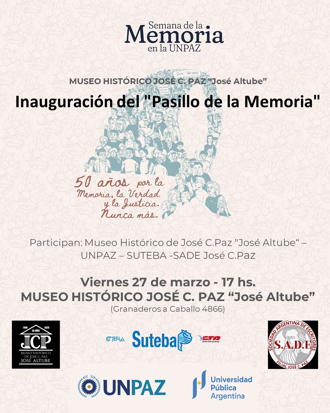 - Museo Histórico de José C. Paz «José Altube», Granaderos a Caballo 4866, los Lunes de 14 a 16 hs.